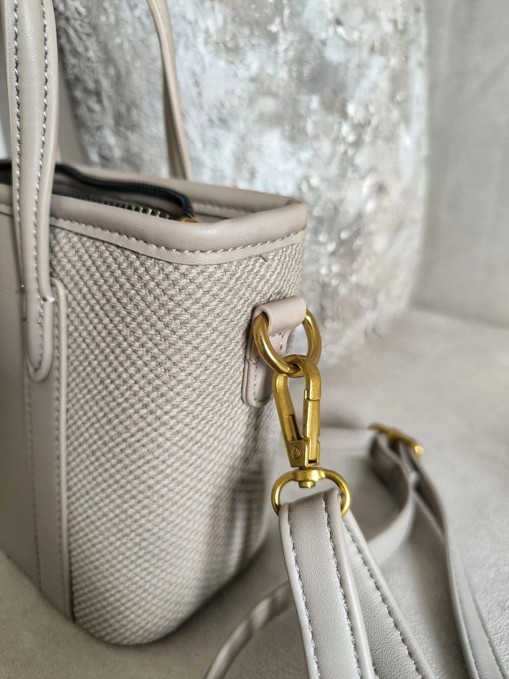 Popruh kabelky je nastavitelný. Zapínání je na zip. Kování je zlaté/žluté.