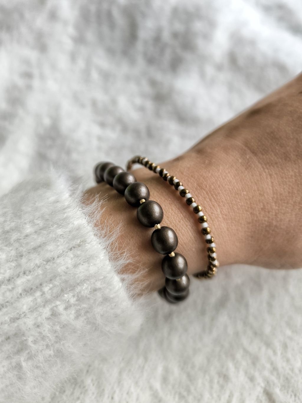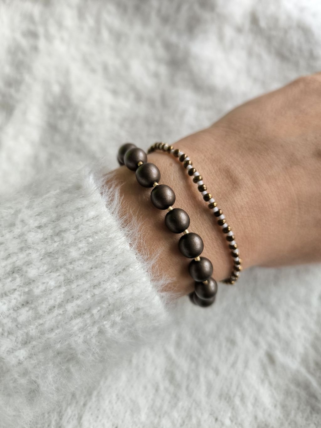 Dvojice náramků v barvách čokolády a kávy – teplé, zemité, klidné.
